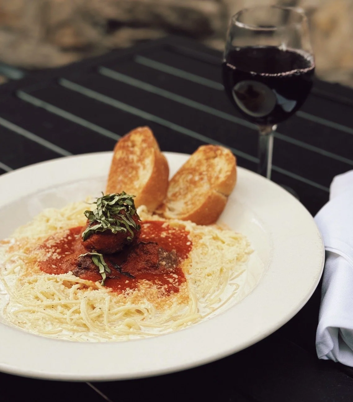 Angel hair pasta tossed in a creamy alfredo sauce, topped with ground beef meatballs, a spicy red sauce, parmesan, and chopped basil. Toasted baguette on the side.