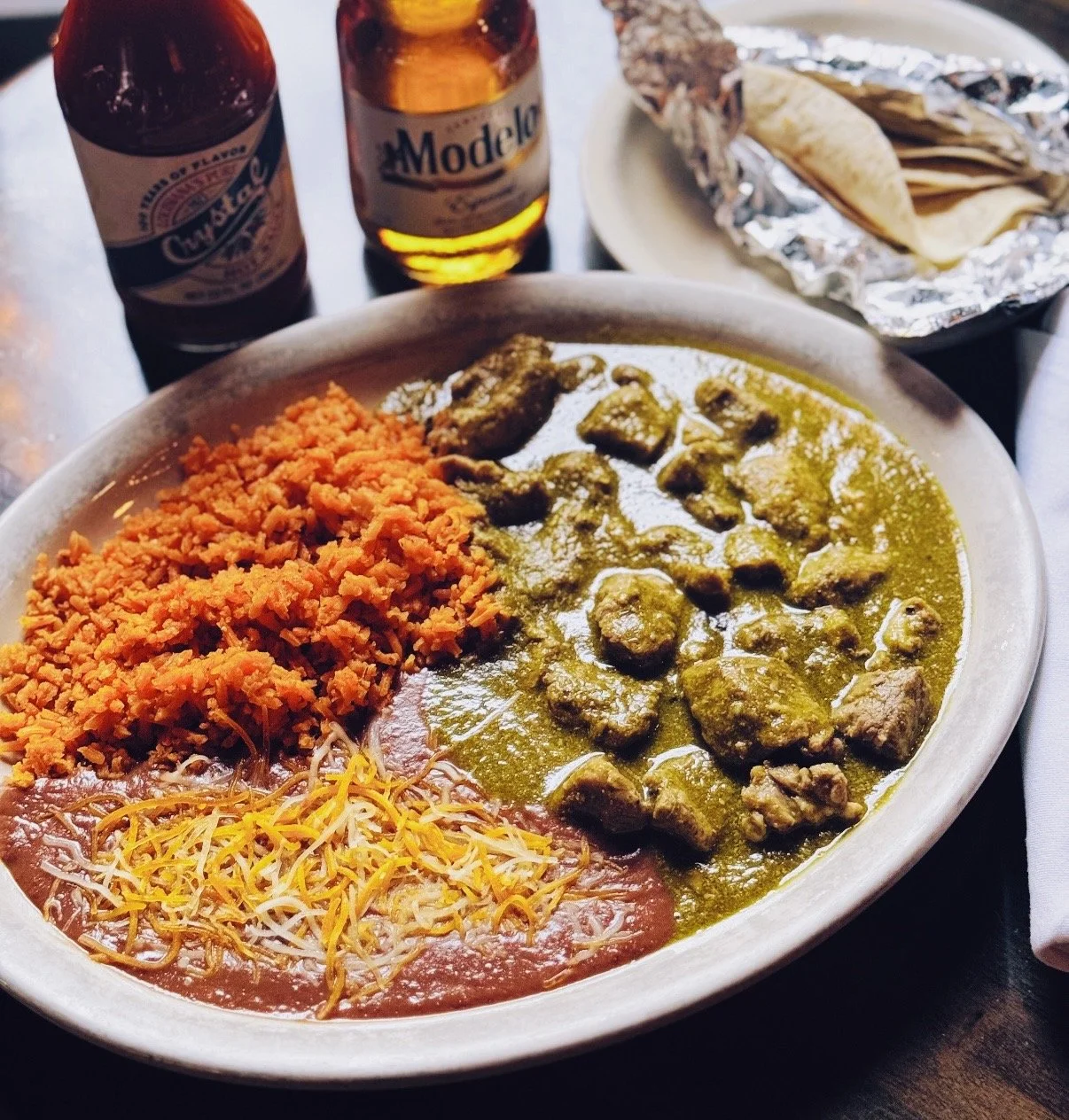 Seasoned and marinated pork served in a tomatillo sauce. Paired with Mexican rice and refried bean, and soft shell flour or corn shells.