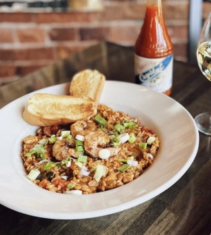 A Cajun favorite with chicken, andouille sausage, shrimp, rice, tomatoes, and peppers. Topped with green onion and toasted baguette.